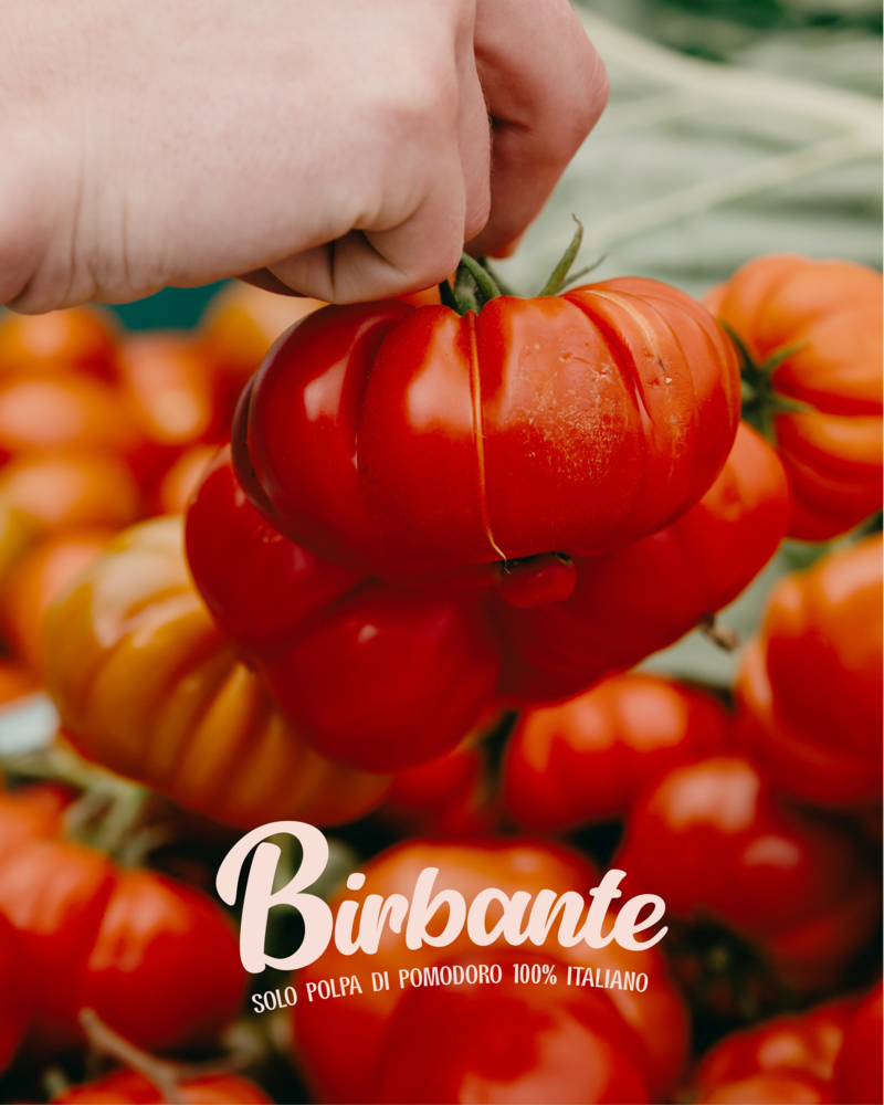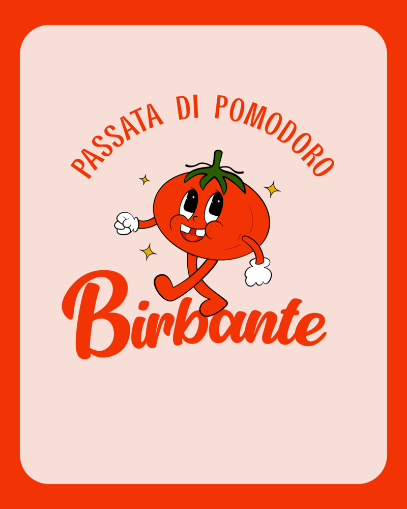 Pomodoro "Birbante" nasce un estate di quelli in cui a casa mia eravamo pieni di cassette di pomodori che un amico di famiglia ci ha regalato. Perciò l'idea di questo brand fittizio che ha messo alla prova le mie abilità con l'introduzione della mascotte.